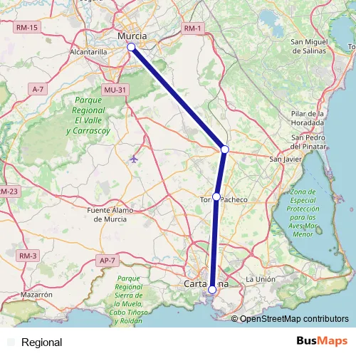 The first stop of the Regional rail route is Cartagena and the last stop is Murcia. Regional is operational during everyday.