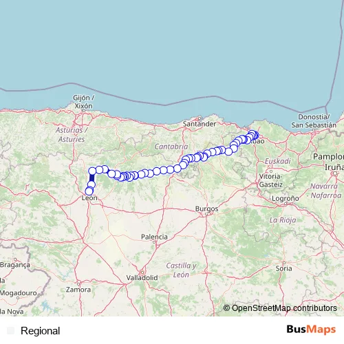 The first stop of the Regional rail route is Bilbao la Concordia and the last stop is Feve-Leon. Regional is operational during everyday.