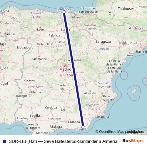 The first stop of the SDR-LEI (Hat) air route is Aeropuerto Seve Ballesteros-Santander and the last stop is Aeropuerto Almería. SDR-LEI (Hat) (Seve Ballesteros-Santander a Almería) is operational during everyday.
