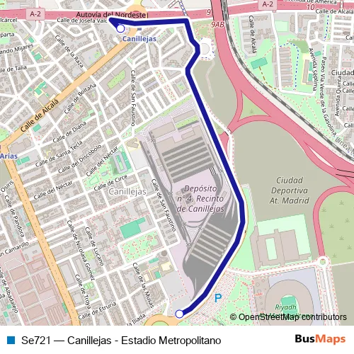The first stop of the Se721 bus route is Canillejas and the last stop is Estadio Metropolitano. Se721 (Canillejas - Estadio Metropolitano) is operational during everyday.