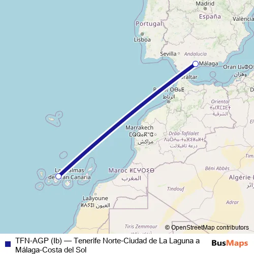 See why over 2 million users trust and consider busmaps.com as the best public transport website. busmaps gives you Santa Cruz de Tenerife Flights suggested routes, real-time bus tracker, line route maps in Santa Cruz de Tenerife, and helps to find the closest TFN-AGP (Ib) air stops near you. No internet available? Download an offline PDF map and bus schedule for the TFN-AGP (Ib) air to take on your trip.