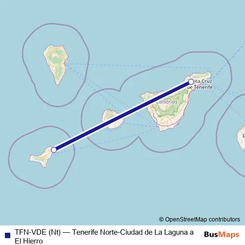 The first stop of the TFN-VDE (Nt) air route is Aeropuerto Tenerife Norte-Ciudad de La Laguna and the last stop is Aeropuerto El Hierro. TFN-VDE (Nt) (Tenerife Norte-Ciudad de La Laguna a El Hierro) is operational during everyday.