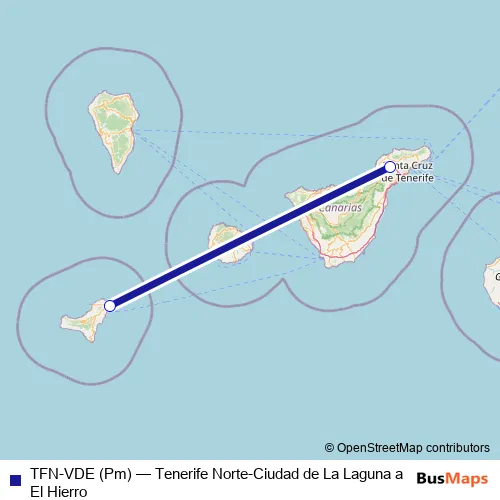 The first stop of the TFN-VDE (Pm) air route is Aeropuerto Tenerife Norte-Ciudad de La Laguna and the last stop is Aeropuerto El Hierro. TFN-VDE (Pm) (Tenerife Norte-Ciudad de La Laguna a El Hierro) is operational during everyday.