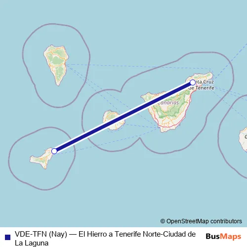 The first stop of the VDE-TFN (Nay) air route is Aeropuerto El Hierro and the last stop is Aeropuerto Tenerife Norte-Ciudad de La Laguna. VDE-TFN (Nay) (El Hierro a Tenerife Norte-Ciudad de La Laguna) is operational during everyday.