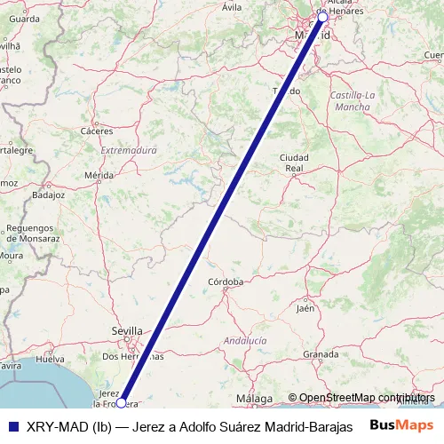 The first stop of the XRY-MAD (Ib) air route is Aeropuerto Jerez and the last stop is Aeropuerto Adolfo Suárez Madrid-Barajas. XRY-MAD (Ib) (Jerez a Adolfo Suárez Madrid-Barajas) is operational during everyday.