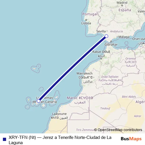 The first stop of the XRY-TFN (Nt) air route is Aeropuerto Jerez and the last stop is Aeropuerto Tenerife Norte-Ciudad de La Laguna. XRY-TFN (Nt) (Jerez a Tenerife Norte-Ciudad de La Laguna) is operational during everyday.
