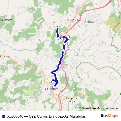 The first stop of the Xg603040 bus route is Ceip Curros Enríquez and the last stop is AS Marabillas. Xg603040 (Ceip Curros Enríquez-As Marabillas) is operational during on weekdays.