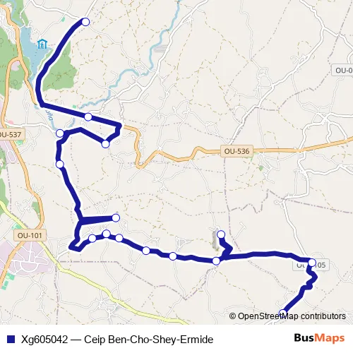 The first stop of the Xg605042 bus route is Ceip Ben-Cho-Shey and the last stop is Ermide (Alén). Xg605042 (Ceip Ben-Cho-Shey-Ermide) is operational during on weekdays.