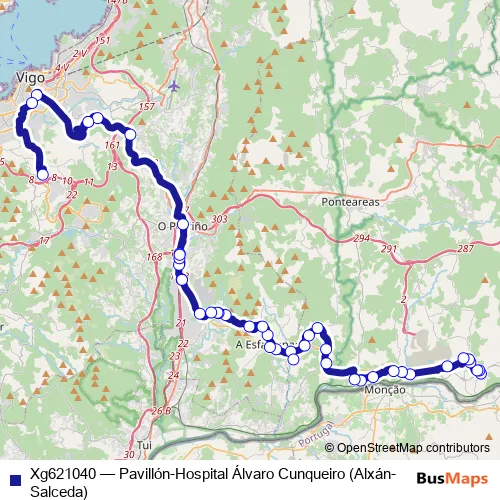 Estrada de Circunvalación - PO-415 - PO-400 - PO-402 - Rúa Rosalía de Castro - Praza da Constitución - Rúa Rosalía de Castro - PO-510 - EP-4103 - EP-4005 - PO-4005 - Rúa Joaquín Fernández Sestelo - Estrada Budiño - Límite Salceda - PO-510 - N-550 - Avenida de Galicia - Avenida de Puxeiros - Autovía do Atlántico - Baixada ao Castelo - Avenida da Gran Vía - Estrada de Clara Campoamor