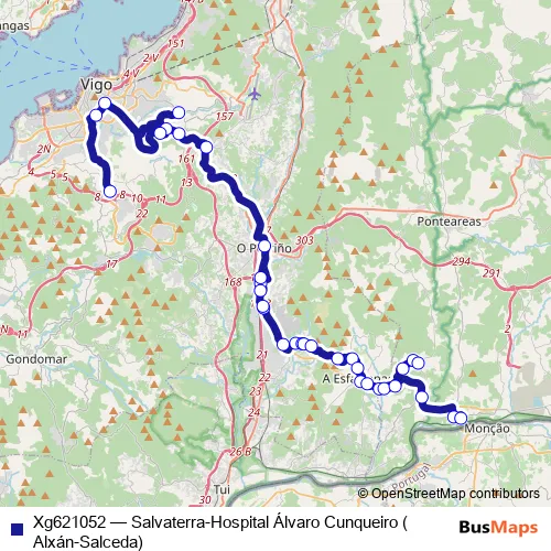Estrada de Clara Campoamor - Avenida da Gran Vía - Avenida de Ramón Nieto - Baixada ao Castelo - Autovía do Atlántico - Avenida de Puxeiros - Avenida de Galicia - N-550 - Rúa A Tolda - PO-510 - Estrada Budiño - Límite Salceda - Rúa Vigo - PO-399 - EP-4005 - EP-4103 - PO-510 - Rúa Rosalía de Castro - Rúa Raiña Doña Urraca