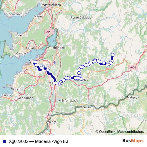 The first stop of the Xg622002 bus route is Maceiras and the last stop is Vigo E.I.. Xg622002 (Maceira -Vigo E.I) is operational during on weekdays.