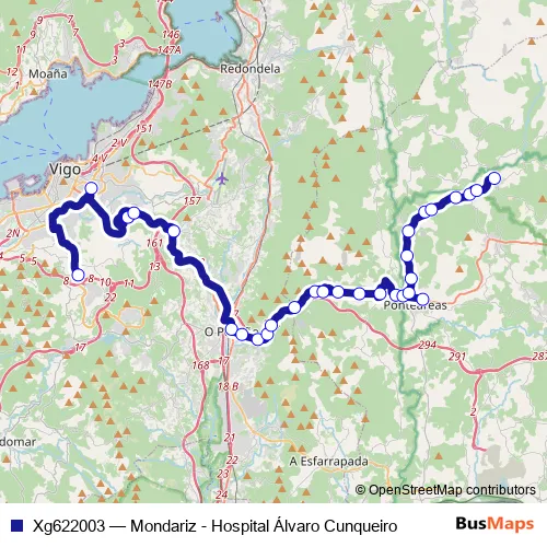 The first stop of the Xg622003 bus route is Hospital Álvaro Cunqueiro and the last stop is Mondariz. Xg622003 (Mondariz - Hospital Álvaro Cunqueiro) is operational during everyday.