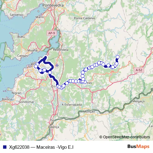 The first stop of the Xg622038 bus route is Vigo E.I. and the last stop is Maceiras. Xg622038 (Maceiras -Vigo E.I) is operational during on weekdays.
