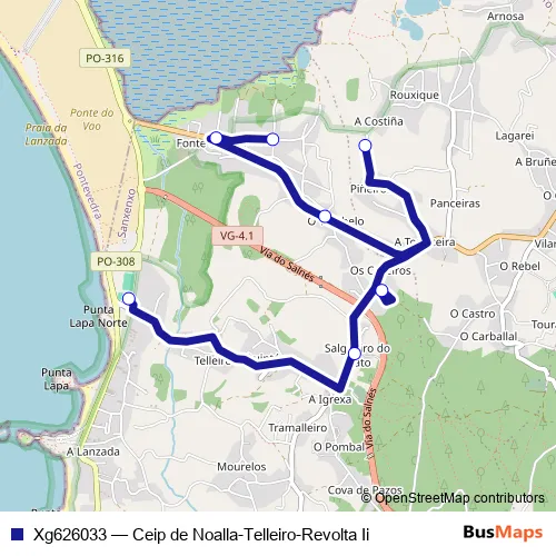 The first stop of the Xg626033 bus route is Ceip de Noalla-Telleiro and the last stop is Revolta Ii. Xg626033 (Ceip de Noalla-Telleiro-Revolta Ii) is operational during on weekdays.