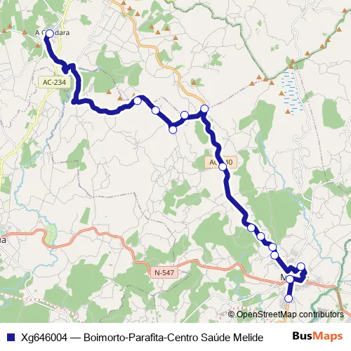 The first stop of the Xg646004 bus route is Boimorto and the last stop is Centro Saúde Melide. Xg646004 (Boimorto-Parafita-Centro Saúde Melide) is operational during on weekdays.