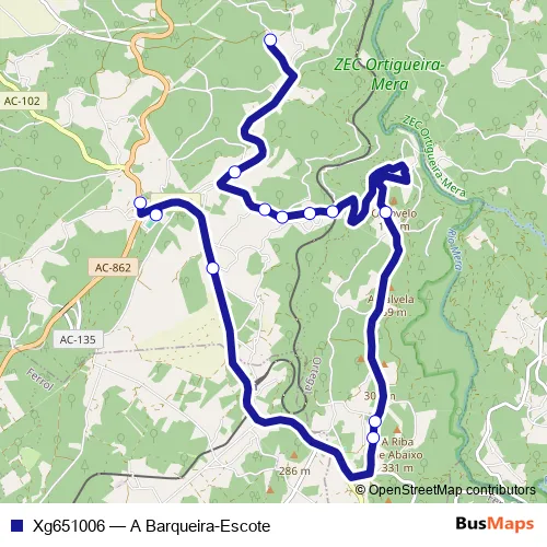The first stop of the Xg651006 bus route is A Barqueira and the last stop is Escote. Xg651006 (A Barqueira-Escote) is operational during on weekdays.