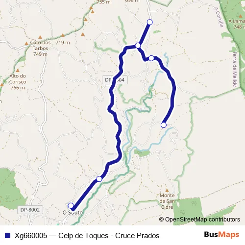 The first stop of the Xg660005 bus route is Cruce Prados and the last stop is Ceip de Toques. Xg660005 (Ceip de Toques - Cruce Prados) is operational during on weekdays.