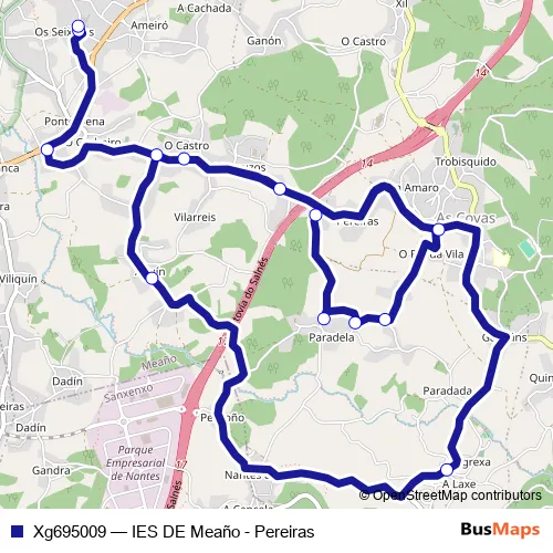 The first stop of the Xg695009 bus route is Pereiras and the last stop is IES de Meaño. Xg695009 (IES DE Meaño - Pereiras) is operational during on weekdays.