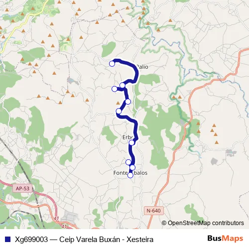 The first stop of the Xg699003 bus route is Ceip Varela Buxán and the last stop is Xesteira. Xg699003 (Ceip Varela Buxán - Xesteira) is operational during on weekdays.