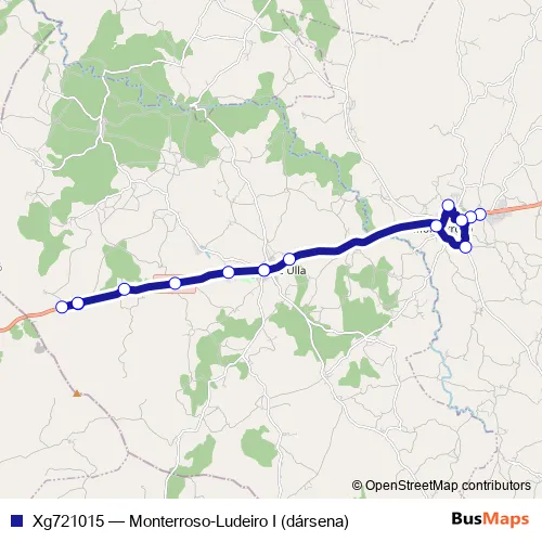 The first stop of the Xg721015 bus route is Ludeiro I (Dársena) and the last stop is Monterroso. Xg721015 (Monterroso-Ludeiro I (dársena)) is operational during on weekdays.