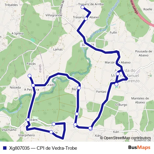 The first stop of the Xg807035 bus route is CPI de Vedra and the last stop is Trobe. Xg807035 (CPI de Vedra-Trobe) is operational during on weekdays.