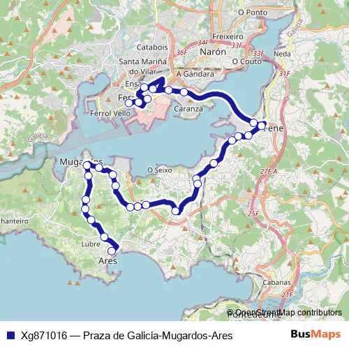 The first stop of the Xg871016 bus route is Plaza de Galicia and the last stop is Ares. Xg871016 (Praza de Galicia-Mugardos-Ares) is operational during on weekdays.