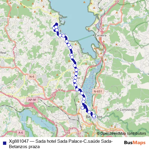 The first stop of the Xg881047 bus route is Sada Hotel Sada Palace and the last stop is Betanzos Praza. Xg881047 (Sada hotel Sada Palace-C.saúde Sada-Betanzos praza) is operational during on weekdays.
