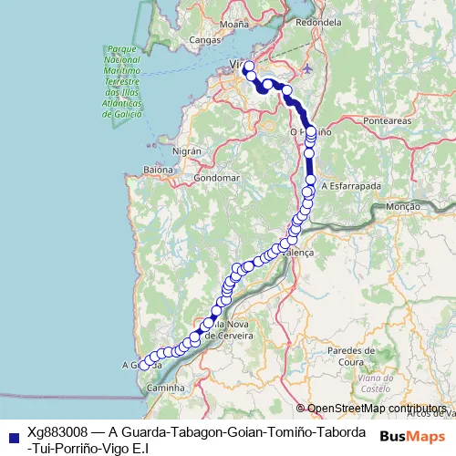 Rúa Manuel Álvarez - Rúa Galicia - Rúa José María Sexto - Estrada Tui - A Guarda - Estrada das Eiras - Camiño das Ladaíñas - Avenida do Brasil - PO-552 - PO-344 - Camiño do Alivio - PO-344 - Rúa Daniel Calzado Poceiro - Rúa Gondomar - PO-344 - PO-350 - PO-552 - N-551 - Estrada da Guarda - Rúa Ourense - Avenida da Concordia - N-550 - Estrada Cerquido - Ribadelouro - N-550 - Avenida Domingo Bueno - Rúa Fernández Areal - Avenida de Galicia - Avenida de Puxeiros - Baixada ao Castelo - Avenida de Madrid - Rúa Serafín Avendaño