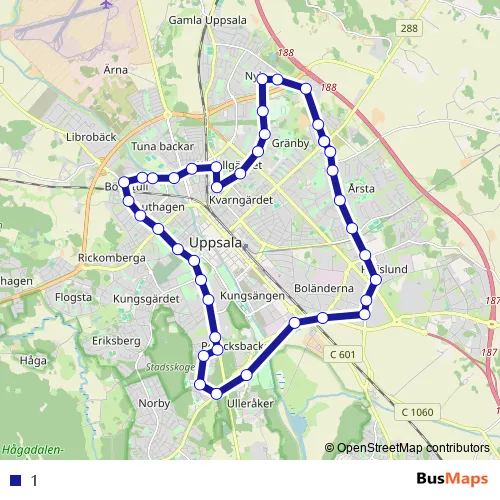 The first stop of the 1 bus route is Uppsala Gränbystaden and the last stop is Uppsala Gränbystaden. 1 is operational during everyday.