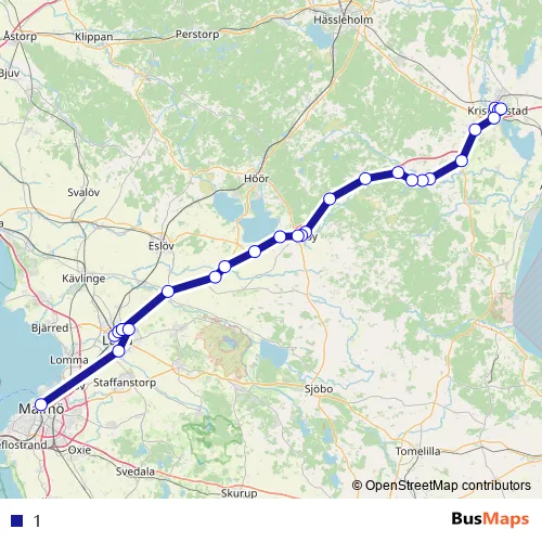 The first stop of the 1 bus route is Kristianstad Centralstation and the last stop is Malmö Centralstation. 1 is operational during everyday.