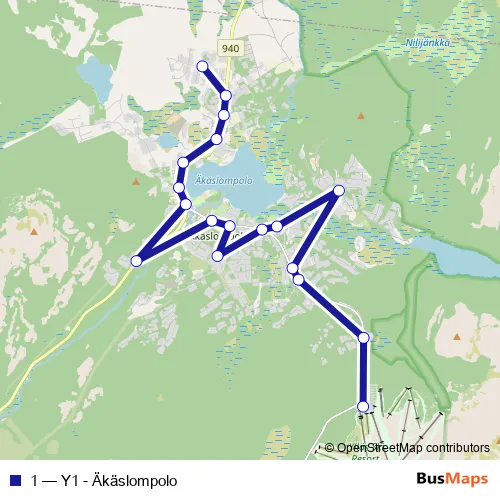 The first stop of the 1 bus route is Y1 [Äkäslompoloon] and the last stop is Helukka. 1 (Y1 - Äkäslompolo) is operational during everyday.