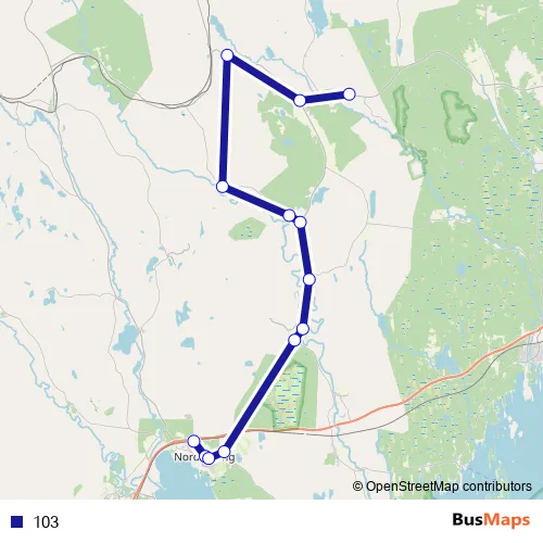 The first stop of the 103 bus route is Nordmaling Resecentrum/Station and the last stop is Gräsmyr centrum. 103 is operational during on weekdays.