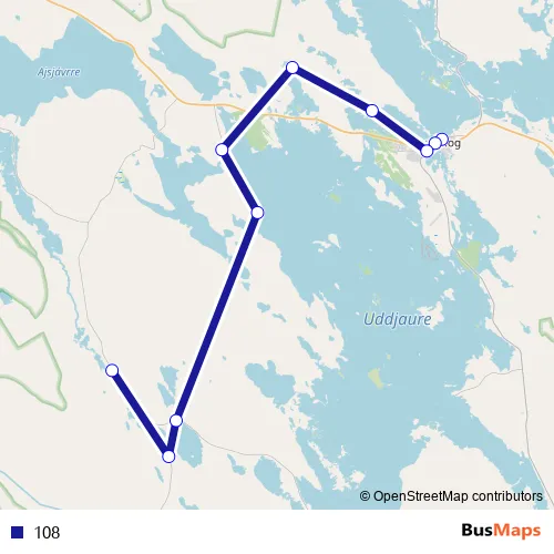 The first stop of the 108 bus route is Arjeplog busstation and the last stop is Vaxborg. 108 is operational during on weekdays.