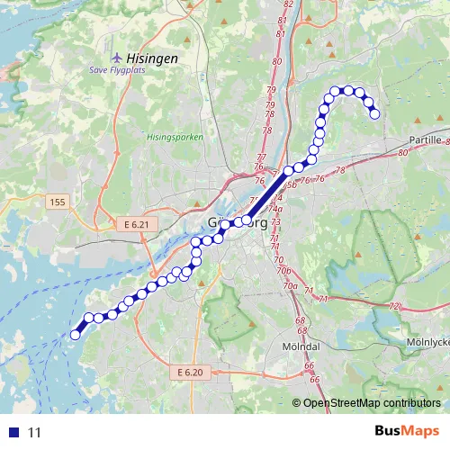 The first stop of the 11 tram route is Göteborg Saltholmens Brygga and the last stop is Bergsjön Komettorget. 11 is operational during everyday.