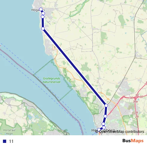 The first stop of the 11 bus route is Höganäs Busstorget and the last stop is Helsingborg Centralstation. 11 is operational during everyday.
