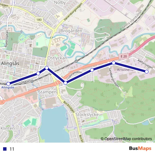 The first stop of the 11 bus route is Alingsås station and the last stop is Maskingatan. 11 is operational during on weekdays.