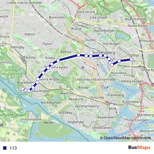 The first stop of the 113 bus route is Blackebergs gård and the last stop is Solna centrum T-bana. 113 is operational during everyday.