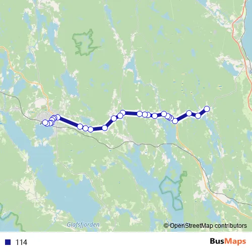 The first stop of the 114 bus route is Skog and the last stop is Arvika busstation/Solbergsgränd. 114 is operational during on weekdays.