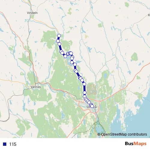 The first stop of the 115 bus route is Rödånäs and the last stop is Umeå Vasaplan. 115 is operational during on weekdays.