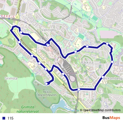 The first stop of the 115 bus route is Vällingby and the last stop is Vällingby. 115 is operational during everyday.