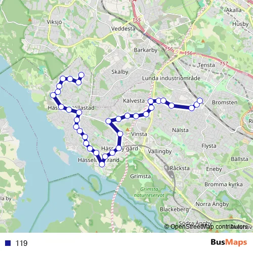 The first stop of the 119 bus route is Backlura and the last stop is Spånga station. 119 is operational during everyday.