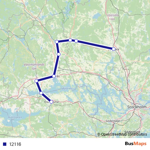The first stop of the 12116 rail route is Eskilstuna Centralstation and the last stop is Uppsala Centralstation. 12116 is operational during on weekends.