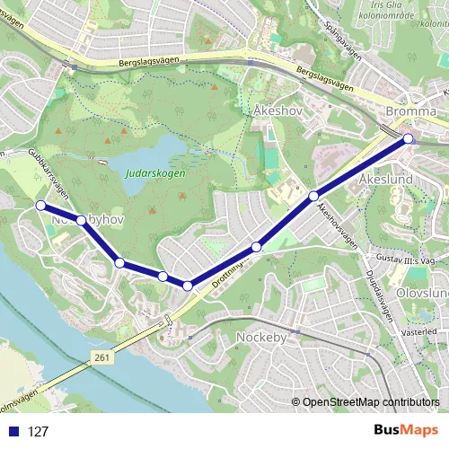 The first stop of the 127 bus route is Nockebyhov and the last stop is Brommaplan T-bana. 127 is operational during everyday.
