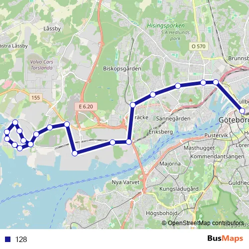 The first stop of the 128 bus route is Göteborg Nils Ericsonterminal and the last stop is Arendal Portal. 128 is operational during on weekdays.