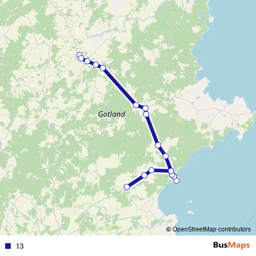 The first stop of the 13 bus route is Roma busstation and the last stop is Garde kyrka. 13 is operational during on weekdays.