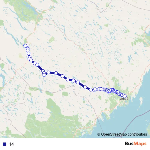 The first stop of the 14 bus route is Vilhelmina station and the last stop is Umeå Universitetssjukhuset. 14 is operational during everyday.