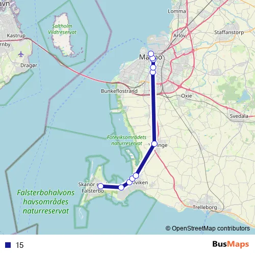 The first stop of the 15 bus route is Skanör Haga and the last stop is Malmö Centralstation. 15 is operational during everyday.
