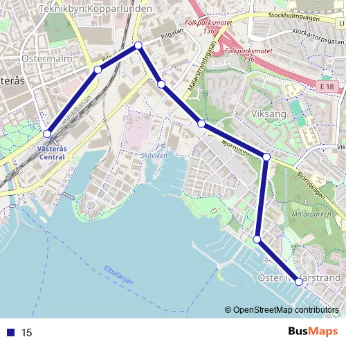The first stop of the 15 bus route is Öster Mälarstrand and the last stop is Västerås Centralstation. 15 is operational during everyday.