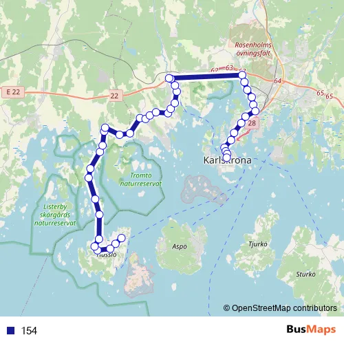 The first stop of the 154 bus route is Hasslö Horn kyrka and the last stop is Karlskrona centrum. 154 is operational during everyday.