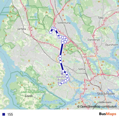 The first stop of the 155 bus route is Akalla T-bana and the last stop is Brommaplan T-bana. 155 is operational during on weekdays.